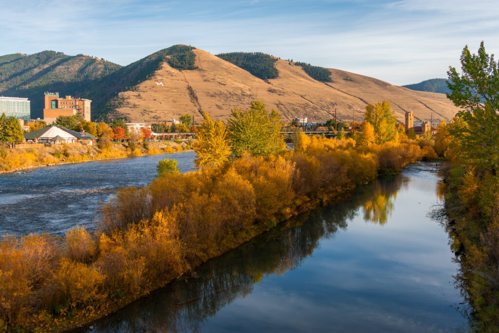 A sunny day in Downtown Missoula with fall colors reflected in the Clark Fork River.