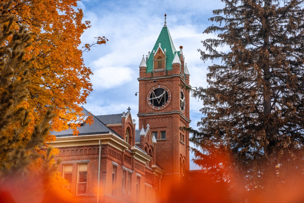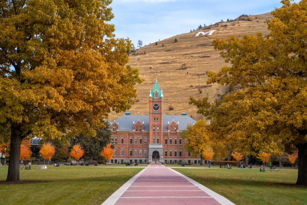 Fall colors come alive at the University of Montana campus with Main Hall in the background.