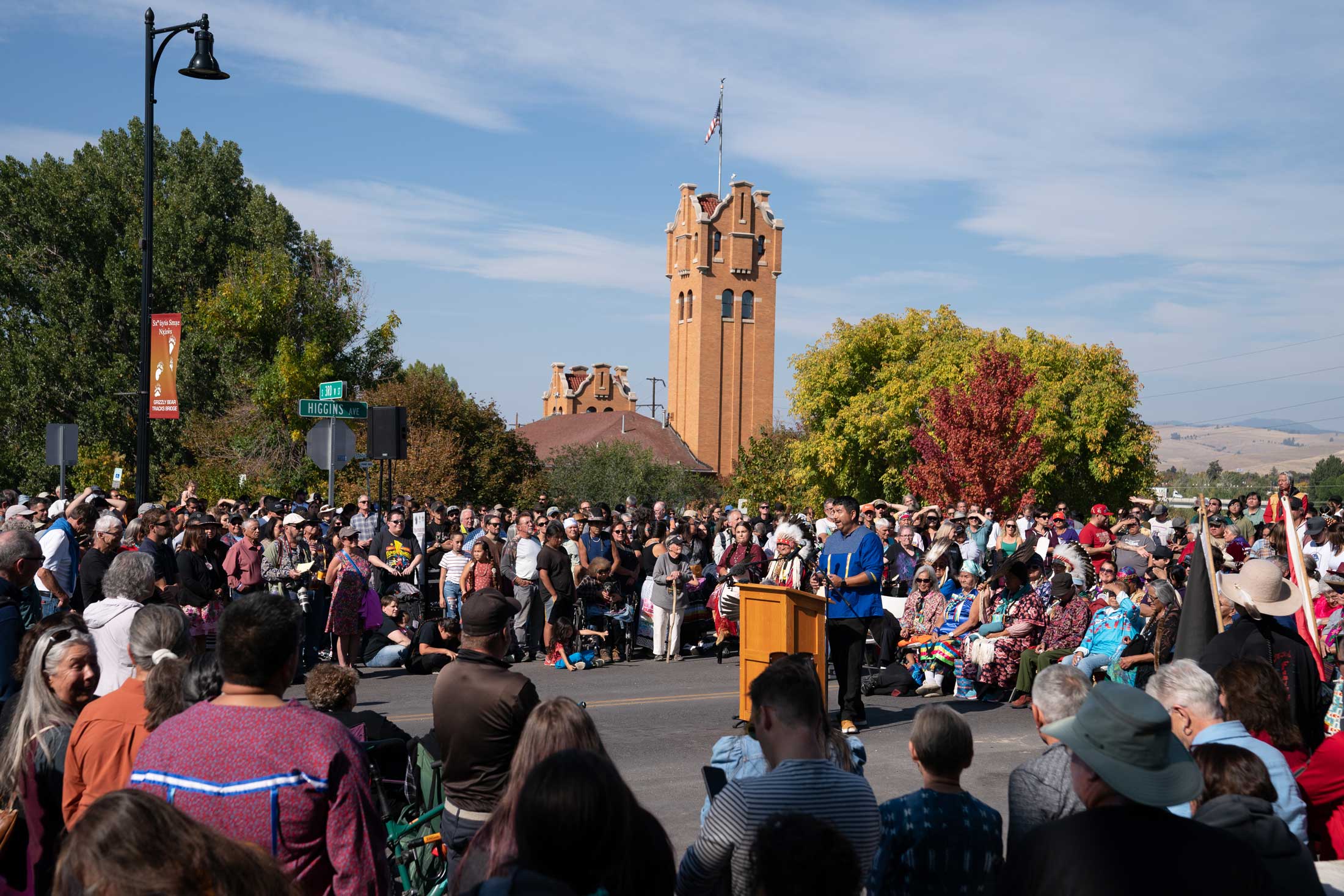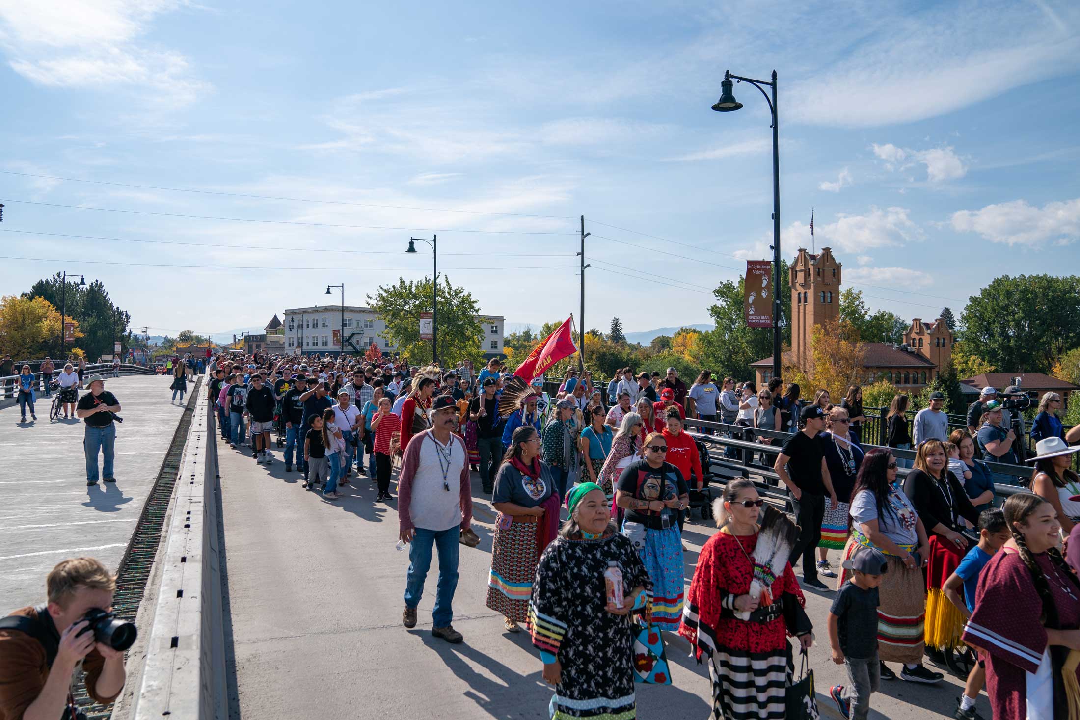 To commemorate Indigenous Peoples’ Day on October 10, 2022, members of the Missoula community and the Confederated Salish and Kootenai Tribes gathered to rededicate the bridge that connects downtown Missoula over the Clark Fork River via Higgins Avenue.